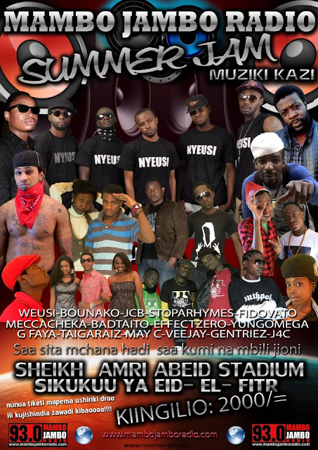 Mambo Jambo Summer Jam,Concert itayofanyika siku ya Iddi Mosi pale Sheikh Amri Abeid Stadium Arusha from Saa sita mchana hadi jioni na round hii A City is in tha houseeee!!! Bounako, StopaRhymez, Fidovato, WEUSI, TaigaRaiz, Badtaito, J4c, MayC, Veejay, Gfaya, Meccacheka, EffectZero, Gentriez, YungOmega na MirryCandle juu ya stage la kibabe, sound ya kibabe so kama vp jichange buku mbili siku iyo tewnde sawa kibabeeeeeee!!!!endelea kuskiza radio yako inayoaminika..93.0 Mambo Jambo Radio..